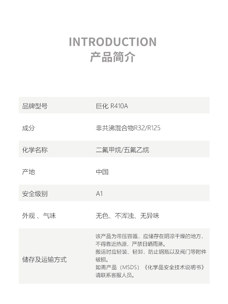 巨化制冷劑是國內(nèi)制冷劑品牌,巨化R410A制冷劑,別名R410A,商品名稱有SUVA 410A、SUVA 9100、Genetron AZ-20、Genetron 410A、Puron410A等。由于R-410A屬于HFC型近共沸環(huán)保制冷劑 (完全不含破壞臭氧層的CFC、HCFC),廣泛用于新冷凍設(shè)備上的初裝和維修過程中的再添加。
